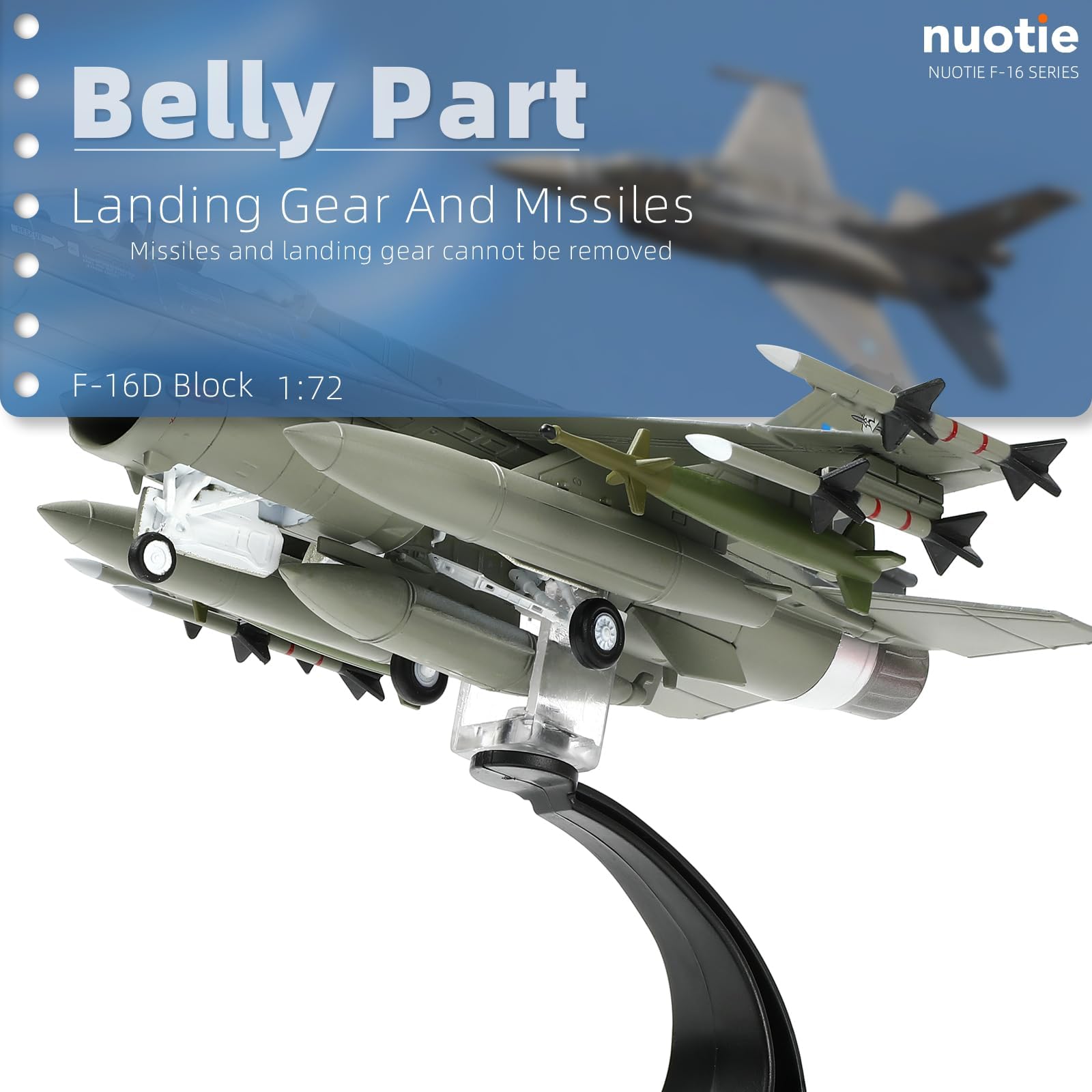 - 【Size and Details】- The NUOTIE 1/72 diecast aircraft model has an awesome scale size. The overall dimensional size is 8.07 * 5.51 *2.56 inches and it weighs 0.36 pounds, yet the detail and craftsmanship of its presentation gives it a visual effect of heavy realism. The twin-engine cockpit has a simulated pilot model, 9 missile models in the belly, landing gears and other small details crafted to satisfy your quest for detail.