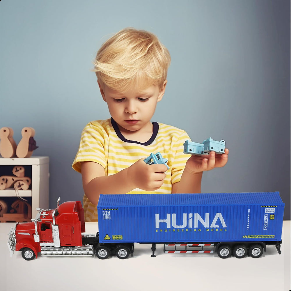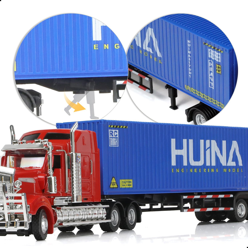 This HUINA semi-truck model is a remarkably detailed and solidly built piece that delivers excellent quality and realism. Made primarily of die-cast metal, it has a satisfying weight and sturdiness that sets it apart from typical plastic models. It feels durable and premium, with no sense of hollowness.
