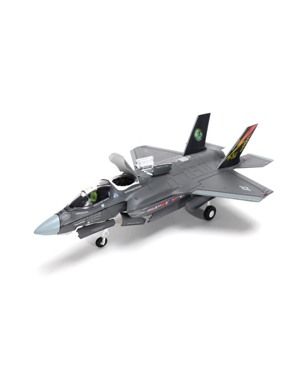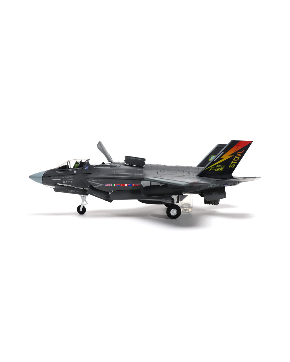 The model is a very detailed, beautiful representation of an F-35B Lightning II. The model features the aircraft in a pre-takeoff position with lift engine doors open, the weapon bays open and the landing gear extended. I glued the three pieces of the stand together using a cyanoacrylate instant glue to prevent the stand from falling apart or accidentally losing the clear acrylic plastic aircraft mount. I did not glue the aircraft to the stand. Although the detail of the aircraft pilot representation isn't the best, I highly recommend this model of the F-35B Lightning II aircraft to aircraft enthusiasts.